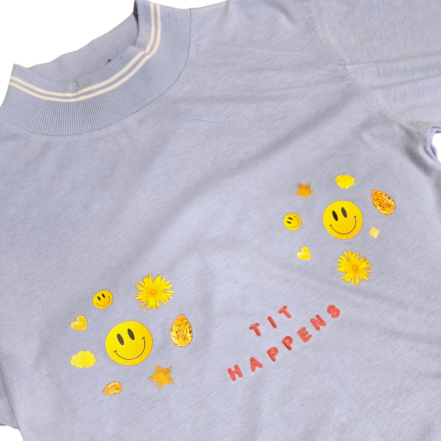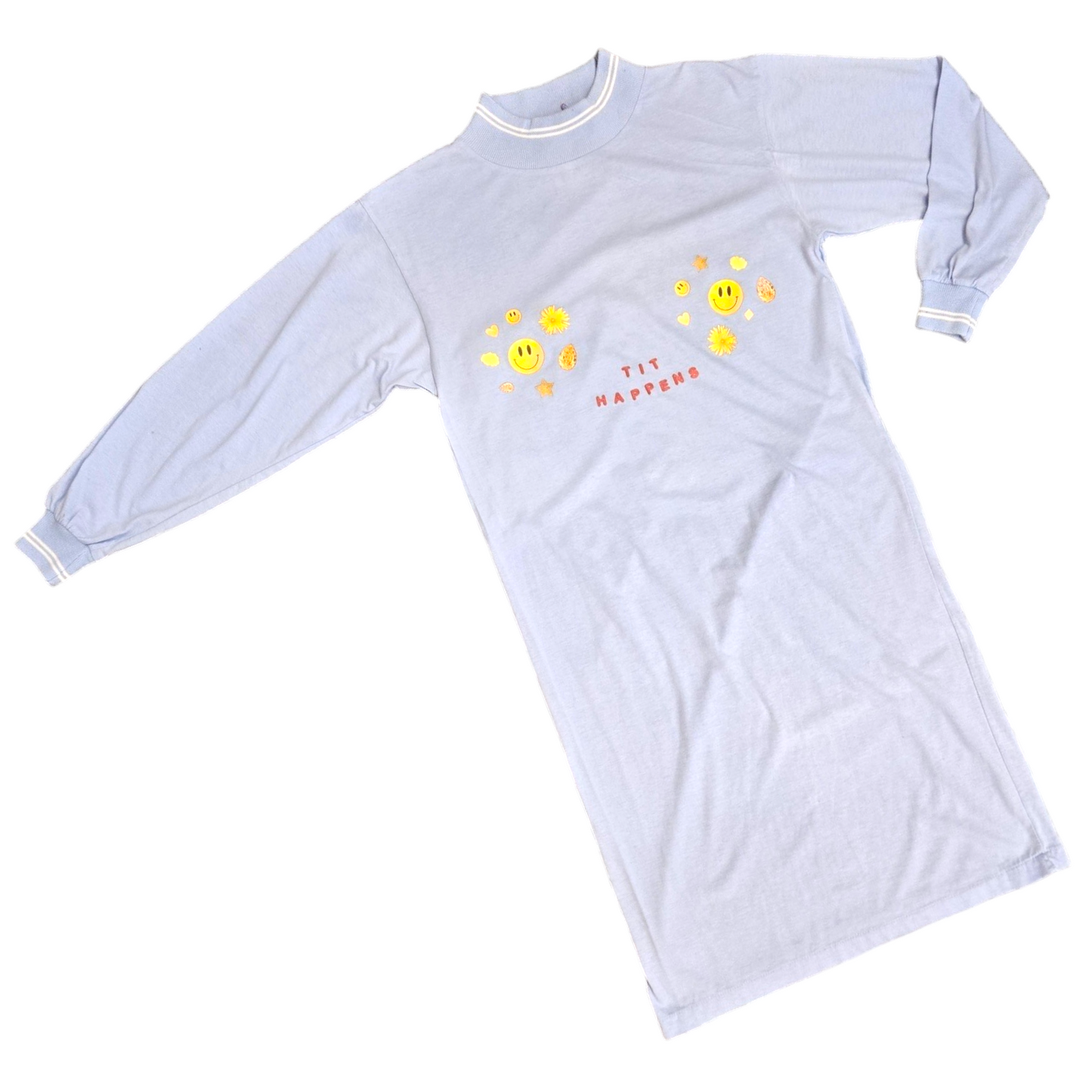 Powder blue medium long sleeve and crewneck tee dress with yellow decals on the chest above the wording “tit happens”
