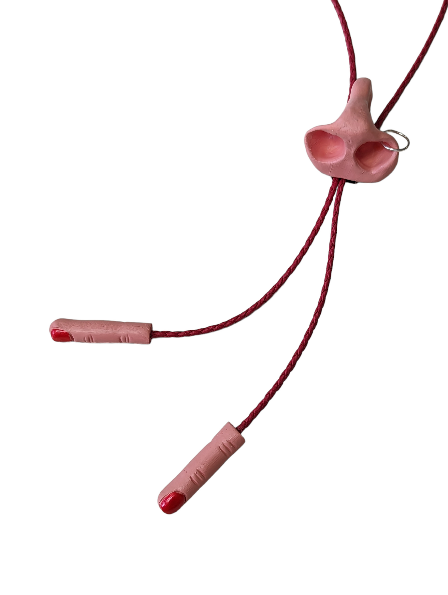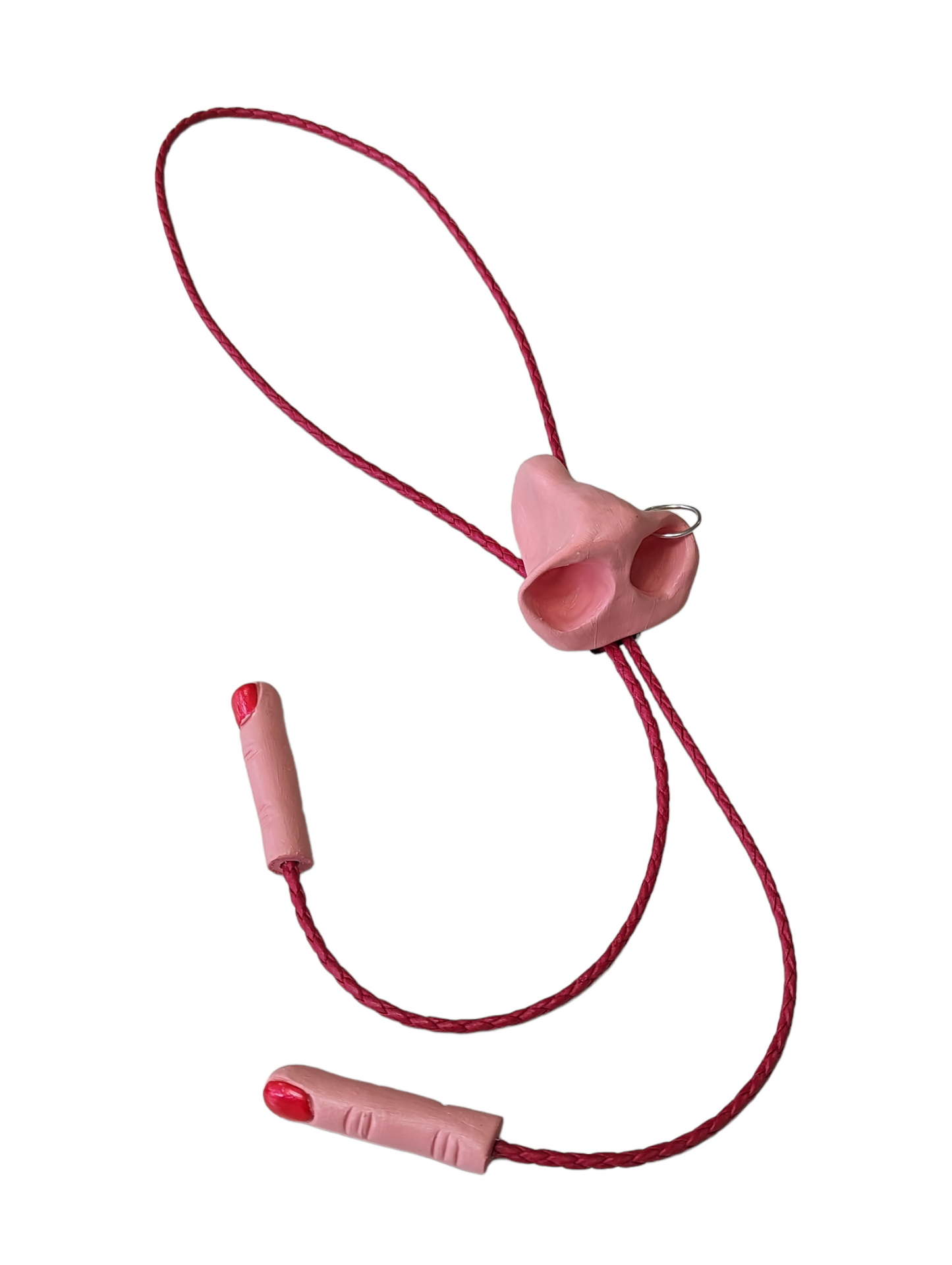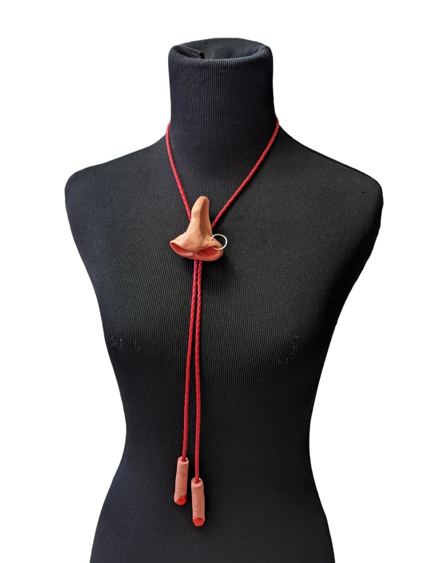 "Pick Me" Handmade Bolo Tie by Aspiring Tree Made with sculpted clay and a leather cord, featuring metal piercing!
